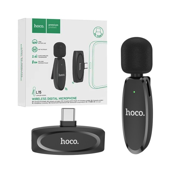 Buy Hoco Wireless Microphone L15 Crystal Lavalier with Type-C Connector Black. Hoco L15 omni-directional condenser microphone with  Type-C connector. Compatible with  Type-C devices, convenient for audio and video recording. Tie microphone records high quality sound by connecting directly to  Type-C devices equipped with a  Type-C connector. It has a clip attached that makes it easy to clip to clothes. The microphone provides a low noise level, and a special soundproof sponge ensures clear sound. Suitable for indoor and outdoor use.
